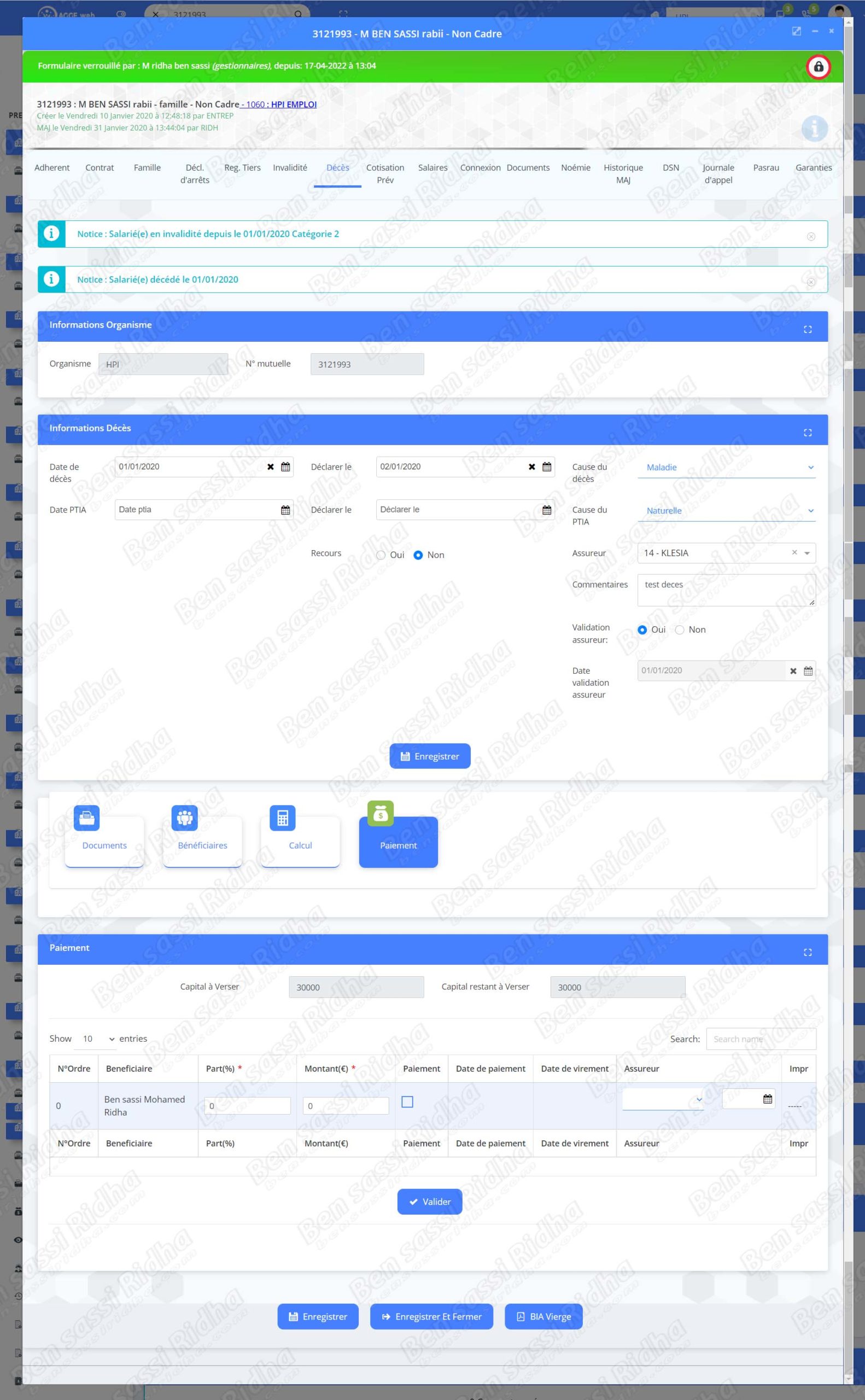 (Death capital calculation, beneficiary management, payments)